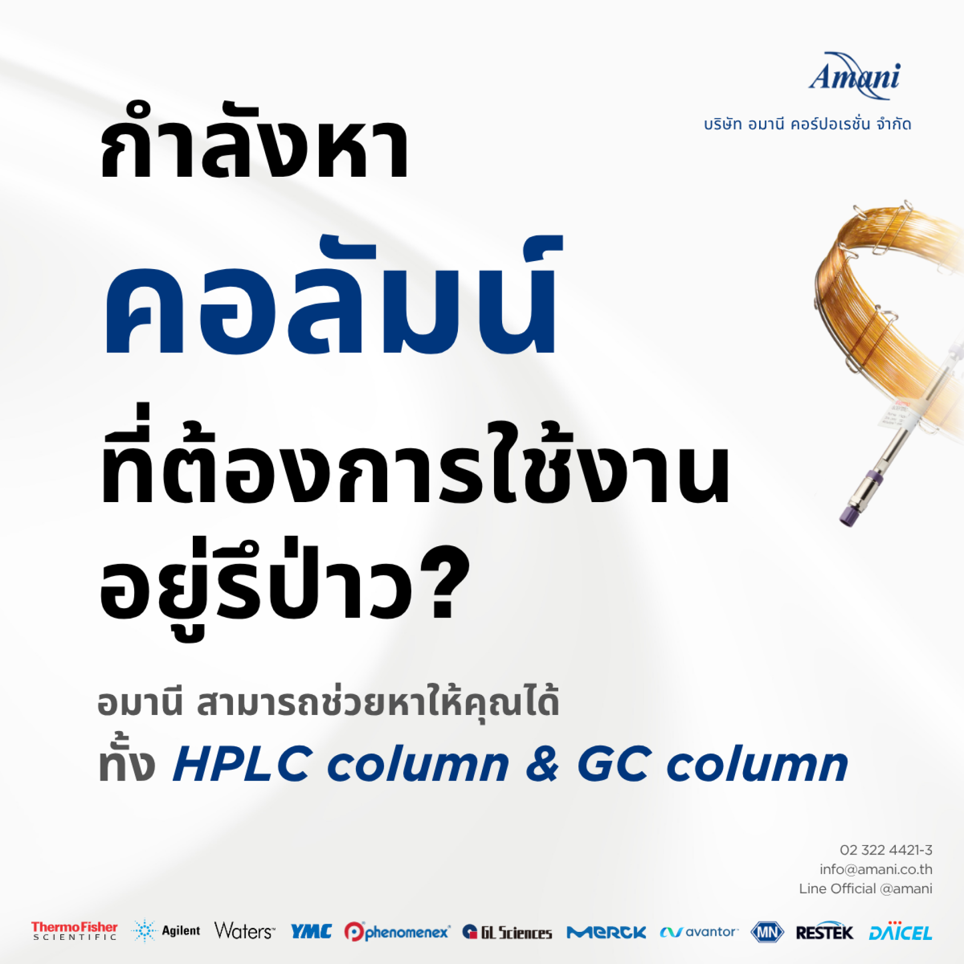 ลูกค้าที่สนใจบริการค้นหาคอลัมน์ HPLC และ GC สามารถติดต่อบริษัท อมานี คอร์ปอเรชั่น ได้ทาง: